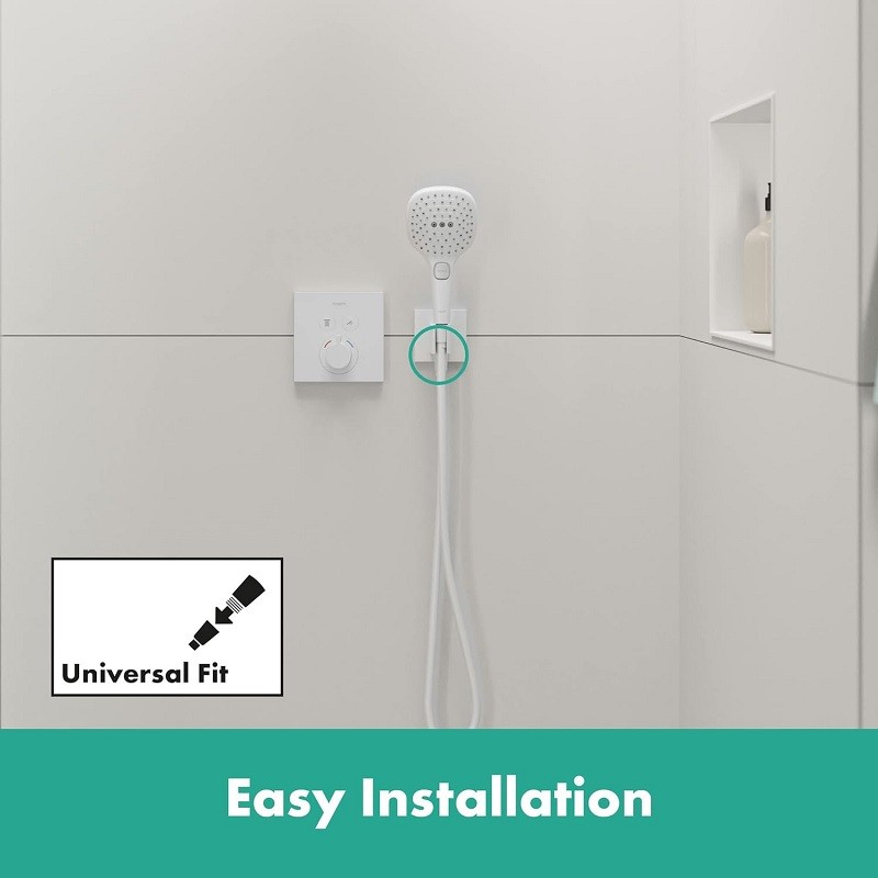 Inštalácia je mimoriadne jednoduchá: FixFit E sa naskrutkuje na existujúci vývod v stene (rozmer G ½, DN15). Potom k nemu môžete pripojiť akúkoľvek komerčne dostupnú sprchovú hadicu. Do držiaka pasujú všetky hadice s kužeľovou maticou – vrátane sprchových hadíc z radu hansgrohe, ktoré sú navyše farebne zladené. Môžete si bez výraznej námahy vytvoriť kúpeľňu snov.