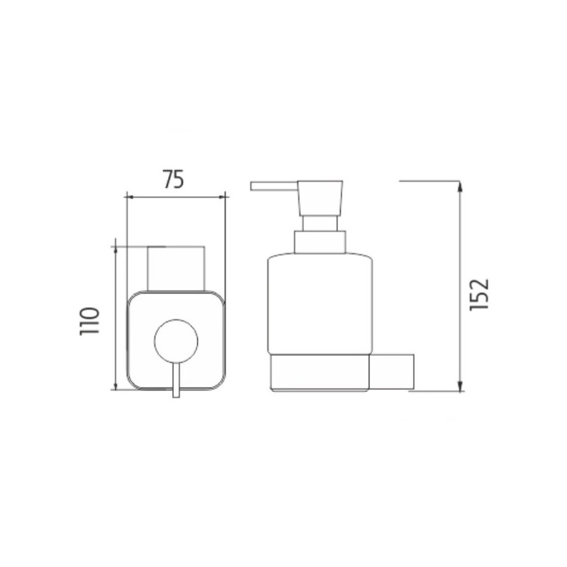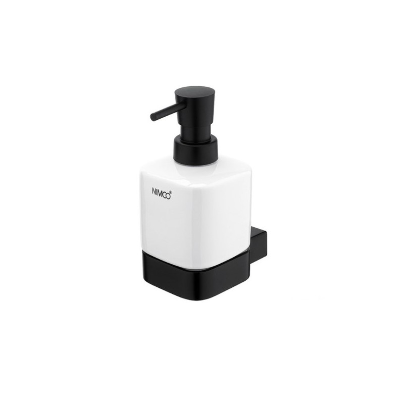 Nástěnný dávkovač na tekuté mýdlo. Nádobka keramická. Úchyt mosaz / černý mat. Objem dávkovače 250 ml.
