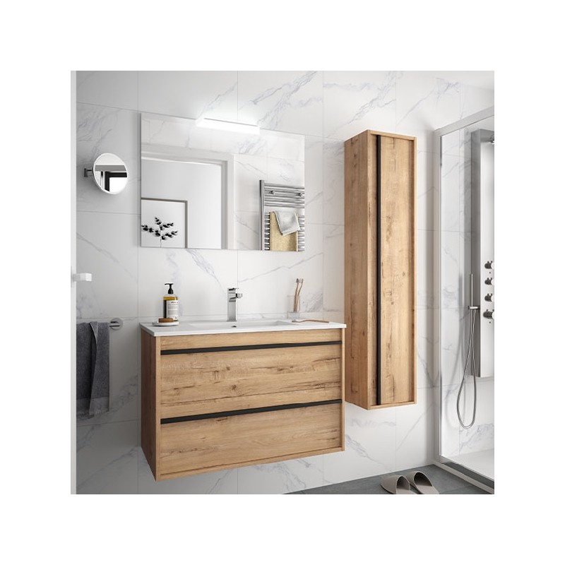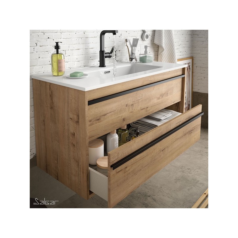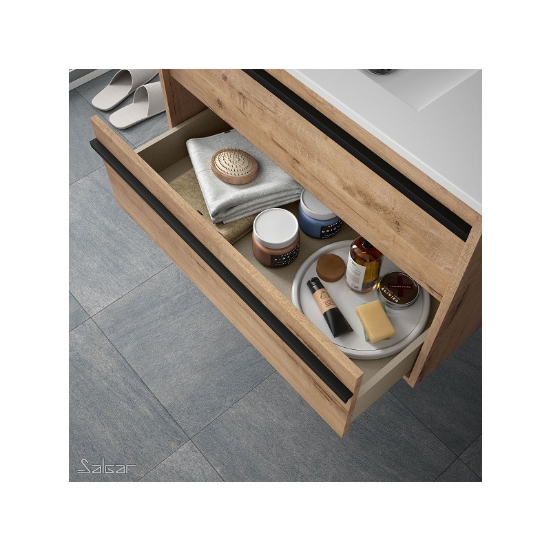 SALGAR ATTILA - umývadlová skrinka + umývadlo CONSTANZA Zostava sa skladá: - 1 ks umývadlová závesná skrinka ATTILA 800 s 2 zásuvkami so SoftClose, - 1 ks keramické umývadlo CONSTANZA 810 s prepadom, Popis výrobku: Umývadlová závesná skrinka Attila 800, - povrchová úprava: africa oak - rozmery skrinky (mm): š.798 x v.540 x h.452 mm, - 2 zásuvky s tlmeným zatváracím mechanizmom pre plynulé zatváranie, - matná čierna rukoväť, - zavesené na stenu, - predná strana a boky vyrobené z 16 mm laminovanej drevotrieskovej dosky (trieda E1) s PVC hranami (s PUR lepidlom), - kovové kovanie s certifikátom kvality, - nábytok je dodávaný v zloženom stave, - Vyrobené v Španielsku, Keramické umývadlo CONSTANZA 810 s prepadom, - vyrobené z bieleho porcelánu, ktorý zaručuje maximálnu odolnosť proti opotrebeniu a čisto bielu farbu, - rozmery umývadla: 810 x 20 x 460 mm,Séria Attila sa vyznačuje charakteristickou matnou čiernou rukoväťou pre všetky povrchové úpravy. Skrinky s dvojitou zásuvkou, zavesené na stenu s hĺbkou 45cm a v šírkach 60-80-100-120(2x60) cm. Zásuvky sú so skrytými pojazdmi a mäkkým zatváraním. Materiály: Bočné a predné steny, - hrúbka 16 mm, - Lesklá biela (Gloss White): Laminátové drevotrieskové dosky lakované s UV odolným vysoko lesklým polyesterovým lakom, - Dub Ostippo (Ostippo Oak) , Dub Roble (Roble Oak): Laminátová drevotriesková doska, Vnútorné dosky s hrúbkou 16 mm z laminovanej drevotriesky, - Zásuvky: 2 ks drevená zásuvka so skrytými výsuvmi so SoftClose mäkkým zatváraním a výškovým nastavením. Maximálna nosnosť 25 kg, - Všetky dosky použité pri výrobe tejto jednotky sú klasifikované ako Stupeň E-1 s nízkou úrovňou obsahu formaldehydu, - lišta sa líši podľa prevedenia: PVC, ABS (hrana s PUR lepidlom), Kovové časti: - rukoväť : lakovaná hliníková rukoväť v matnej čiernej farbe. - držiaky na skrinky: Vysoko odolný držiak s dvoma samostatnými nastaveniami certifikované podľa DIN 68840 (ekvivalent do 130 kg nosnosti na kus), Povrchy: - povrch exteriéru: Eternity Oak, Ostippo Oak, Gloss White, - povrch Interiéru: Nude (svetlá telová farba),