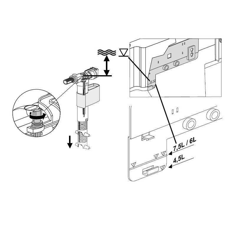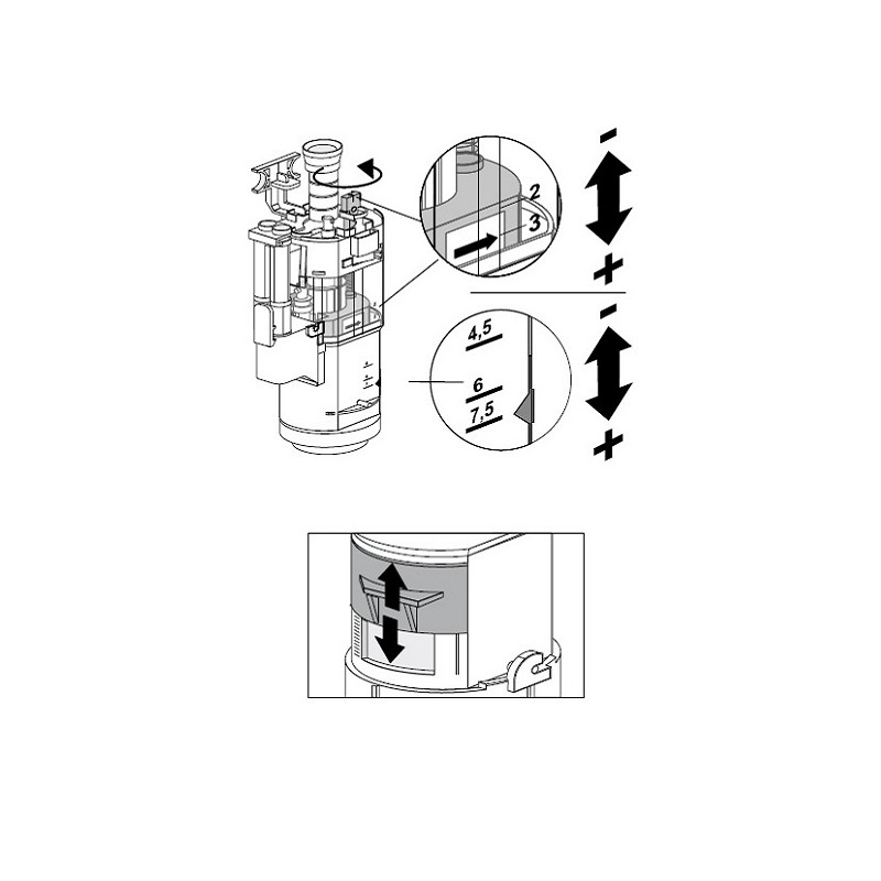 • nádržka SANIT s izoláciou proti kondenzácii (CC-121 -S-FO-2V-2C), s dvojitým splachovaním (7,5-4,5l/4-2l), továrenské nastavenie 6-3 litre, regulátor prietoku vody na vypúšťacom ventile (prietok 1,27 - 2,44 l/s), napúšťací ventil SANIT 510M, Trieda hluku I,