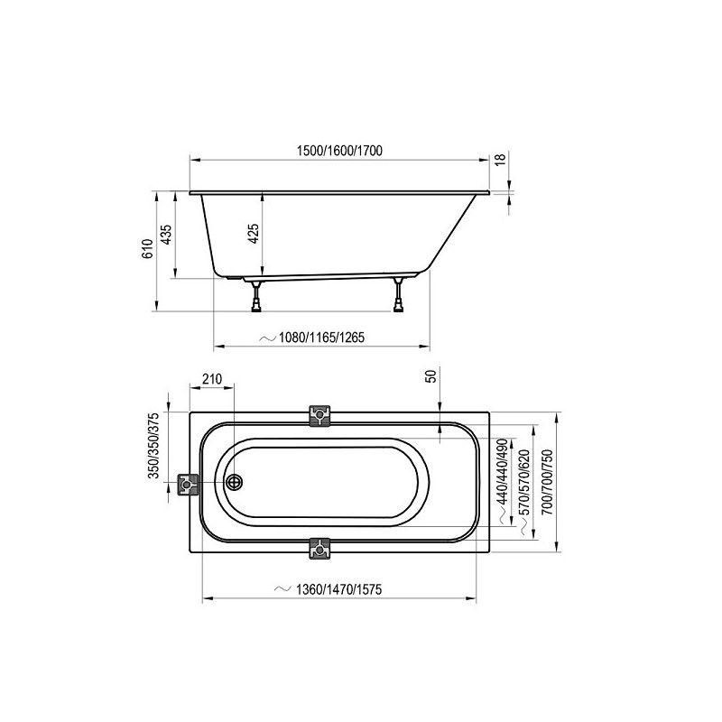 Akrylátová obdĺžniková vaňa s tenkým horným lemom v rozmeroch 170 x 75, 160 x 70, 150 x 70 cm.