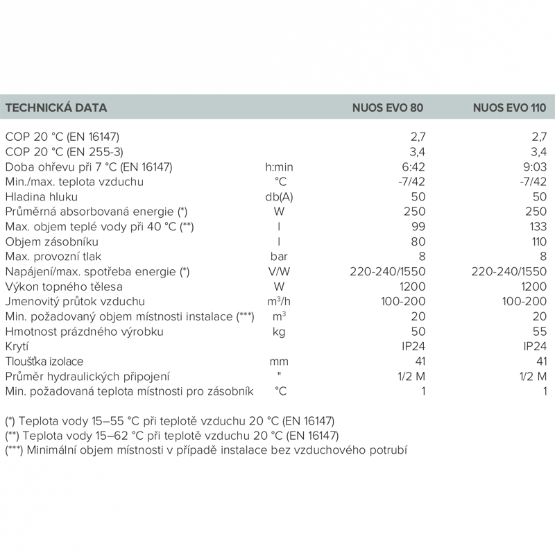 Ohrievač vody na báze tepelného čerpadla. ŠETRÍ AŽ 70% nákladov na energie !!!Technické parametre: • Objem zásobníka: 80 l • Max. prevádzkový tlak: 8 bar • Napájanie / max. spotreba energie (*): 220-240 / 1550 V / W • Výkon vykurovacieho telesa: 1200 W • Menovitý prietok vzduchu: 100-200 m3 / h • Min. požadovaný objem miestnosti inštalácie (***): 20 m3 • Hmotnosť prázdneho výrobku: 55 kg • Krytie: IP24 • Hrúbka izolácie: 41 mm • Priemer hydraulických pripojenie: 1/2 M " • Min. požadovaná teplota miestnosti pre zásobník: 1 ° C • COP 20 ° C (EN 16147) * 2,7 • COP 7 ° C (EN 16147) * 2,45 • Doba ohrevu pri 7 ° C (EN 16147) h: min 8:04 • Min / max teplota vzduchu ° C -5/42 • Hladina hluku: 50 db (A) • Priemerná absorpcia energie (*) 250 W • Max. objem teplej vody pri 40 ° C (**) 128 l • ErP trieda: A +(*) Teplota vody 15-55 ° C pri teplote vzduchu 20 ° C (EN 16147) (***) Minimálny objem miestnosti v prípade inštalácie bez kanalizáciePríprava: • IN vstup SV G 1/2 " • OUT výstup TV G 1/2 "Kompaktný a ľahko sa inštaluje, ohrievač vody tepelné čerpadlo NUOS A + ponúka vynikajúci výkon a spoľahlivosť. Inovácie a výskum spoločnosti Ariston vytvorili ohrievač vody, ktorý môže využívať prirodzený a nevyčerpateľný zdroj energie: vzduchové teplo, čím zaisťuje energetickú účinnosť a úsporu energie. Nuos Evo je optimálnym riešením pre tých, ktorí majú obmedzený priestor. Ohrievač ušetrí aspoň 70% energie v porovnaní s tradičným elektrickým kotlom. Produkt je tak účinný pre dosiahnutie energetickej triedy A +, najvyššej energetickej triedy, ktorá môže byť deklarovaná od septembra 2017.KOMFORT • Funkcia green, boost, auto, boost2, anti-legionella a časovač • Tichý chod (funkcia ticho) efektívnosti a úspor energie • Ekologický plyn R134A dosahuje v pracovnom režime tepelného čerpadla teplôt až do 62 ° C • Pracovný režim tepelného čerpadla pri teplote vzduchu od -5 do 42 ° C • Predĺžená záruka 5 rokov, ktorá sa vzťahuje na prehrdzavenie nádrže • účinný proti anóda a magnéziová anóda • Zásobník s titánovým smaltovanímDESIGN • LCD displej