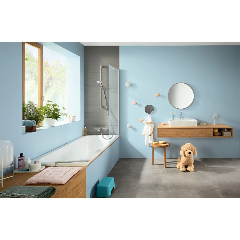 Termostat obsahuje vývod do vane a pripojenie na ručnú sprchu. Zvolenú teplotu vody udržuje termostat Ecostat E pri oboch odberných miest konštantnú. Tento elegantný termostat, inštalovaný na stenu, reguluje okamžite teplotu pri kolísaní tlaku. A aby boli mladí objavitelia chránení pred príliš horúcou vodou, uvoľní bezpečnostná poistka nastavená na 40 °C teplejšiu vodu až po stlačení tlačidla. Užívajte si krásne momenty s vodou bez starostí.