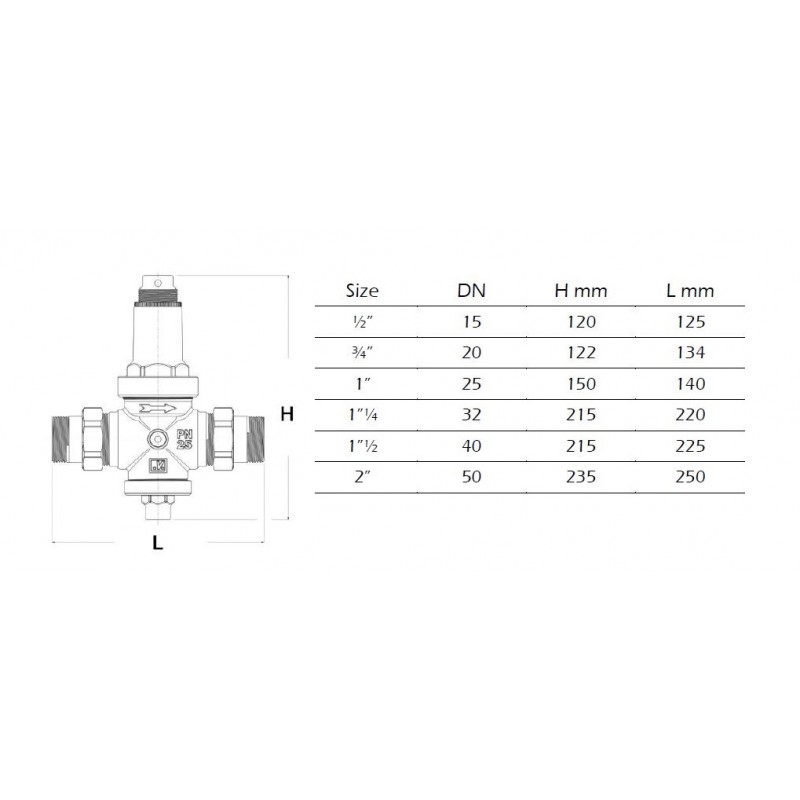 Tlakové mosadzné redukčné ventily udržujú konštantný výstupný tlak na úrovni nastaviteľnej v rozsahu 1,2-6,0 Baru (výrobné nastavenie 3 Bary). Možnosť pripojenia manometra G 1/4" indikujúceho výstupný tlak. Inštalácia redukčného ventilu: Gravitácia nemá na prevádzku redukčných ventilov žiadny vplyv a preto môžu byť v systéme inštalované do akejkoľvek polohy. Redukčný ventil môže byť poškodený nečistotami, ktoré sa vyskytujú vo vode a preto z dôvodu jeho ochrany a všetkých zariadení na výstupe systému odporúčame inštalovať na vstupe redukčného ventilu samočistiaci filter. Ďalej odporúčame nainštalovať do systému zariadenie proti vodnému rázu z dôvodu ochrany vnútorných súčiastok redukčného ventilu. Nastavenie tlaku redukčného ventilu. Všetky redukčné ventily Malgorani sú pred balením testované na skúšobnom zariadení a nastavené na výstupný tlak 3 bary. Potom, čo sa redukčný ventil nainštaluje do systému, dá sa tlak na výstupe jednoducho upraviť. Ak chcete zmeniť tlak na výstupe, stačí povoliť aretačný krúžok a otáčať nastavovacou skrutkou. Otáčaním v smere hodinových ručičiek sa tlak na výstupe zvyšuje a naopak otáčaním proti smeru hodinových ručičiek sa tlak znižuje. Správny tlak sa nastavuje pri uzavretom systéme. Mosadzný redukčný ventil s piestom z nerezovej ocele, s dvoma vonkajšími (MM) závitmi. Možnosť pripojenia manometra so závitom G1/4" PN: 25 bar Výstupný tlak: 0,5 - 6 bar Výrobné nastavenie: 3 bar Max prac. teplota: 80° C (110° C v špeciálnom prevedení) Dostupné dimenzie: 1/2" až 2 1/2" Materiál: mosadz