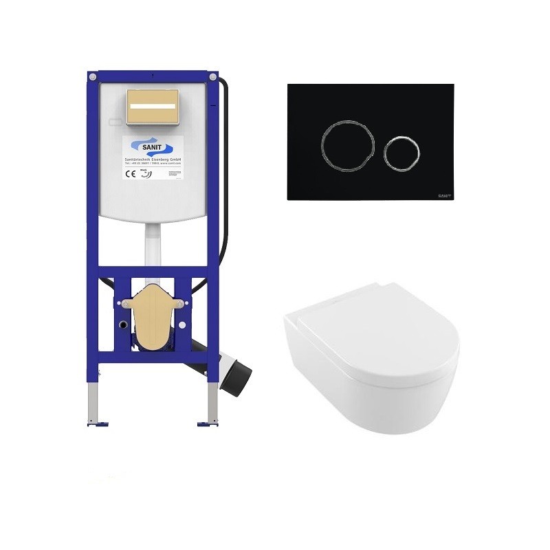 SET sa skladá z: - sanomosný modul pre závesné WC SANIT INEO PLUS S 450s kotvením so zadnej steny - VILLEROY BOCH Avento závesná WC misa s DirectFlush +sedátko so SoftClose biely - tlačítko WC SANIT Ineo CEDO 2C, čierna matná s chrómovou dekoráciousanomosný modul pre závesné WC INEO PLUS S 450s kotvením so zadnej steny• držiaky na stenu • regulátor prietoku splachovania nastaviteľný 1,27 - 2,44 l/s • inšpekčná krabica RevisionBox na pripojenie sprchovacieho WC a elektronického splachovania • chránička na pripojenie sprchovacieho WC a elektronického splachovania • nádoba INEO FreshBox na čistiace tablety bez chlóruPOPIS: • v/š/h: 1 120/450/130 mm, pre závesné WC, • s malým revíznym otvorom, ovládanie spredu (Bowden Technology), • pre 2-činné splachovanie, • samonosný, oceľový rám s práškovým nástrekom, na obloženie sadrokartónom, • montáž na pevnú stenu, do sadrokartónových konštrukcií a pod., • držiaky do zadnej steny (pár) pre nastavenie konštrukcie 135-205mm, • 4-bodové upevnenie, plne predmontované, • samo svorné nožičky s otočnými základovými doskami vhodné pre sadrokartónové profily UW 50 a UW 75 a Sanit Systém 996, rozsah nastavenia nožičiek: 0-200 mm, • nádržka SANIT s izoláciou proti kondenzácii (CC-121 -S-FO-2V-2C), s dvojitým splachovaním (7,5-4,5l/4-2l), továrenské nastavenie 6-3 litre, regulátor prietoku vody na vypúšťacom ventile (prietok 1,27 - 2,44 l/s), napúšťací ventil SANIT 510M, Trieda hluku I, • 2-dielna pripojovacia sada rohového ventilu R ?", • flexibilná hadica napúšťacieho ventilu - možno naskrutkovať rukou (bez náradia), • ochranná skrinka pre prístupový otvor a keramické armatúry, ktorú je možné prirezať, so samolepiacou šablónou na prenos kontrolného otvoru na obklad, • nádoba INEO FreshBox na čistiace tablety bez chlóru • chránička d.21mm na prívod vody do Douche WC a d.16mm na prívod el. kábla na Infra splachovanie • 4-polohová nastaviteľná montážna spona, • WC pripojovací oblúk d:90 mm s prechodovou objímkou PE d:90/110, • WC pripojovacia sada d:90 mm, • 2x závitové tyče M12 pre upevnenie WC s ochranou a maticami, • RevisionBox efektívnejšia ochrana proti vlhkosti, vrát. šablóny na prenesenie prístupových otvorov do obkladového panelu,Upozornenie: Na pripojenie sprchovacej WC misy a elektronické splachovanie je potrebná prípojka A230V. Používané čistiace kocky do INEO FreshBox musia byť vhodné pre plastové nádržky WC a nesmú obsahovať chlór ani žiadne oxidačné zložky, inak môže dôjsť k poškodeniu nádržky.VILLEROY BOCH AVento závesná WC misa s DirectFlush+sedátko so SoftClose biely- misa WC závesná AVENTO DirectFlush 37 x 53 cm biela , - sedátko SoftClose a Qick-release, - vodorovný odpad, DirectFlush: vďaka novému riešeniu neuzavretého a plne glazovaného okraju misy je udržiavanie hygieny jednoduché a rýchle - nastala revolúcia v hygiene. Maximálny splachovací výkon pri minimálnej spotrebe vody šetrí súčasne peňaženku aj životné prostredie. Kombinácia vysokej funkčnosti a moderného, nadčasového designu.tlačítko WC SANIT Ineo CEDO 2C, čierna matná s chrómovou dekoráciou - pre Ineo splachovacie nádrže WC, - rozmery 205/147/8.5 mm - povrch čierna matná s krúžkami z lesklého chrómu, - materiál plast, - dvojité splachovanie bowdenom,